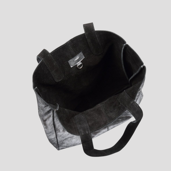 This HYDESTYLE ® tote bag from the Metallic Rimor collection is made of high quality silky suede. The suede is soft to touch with a fine satin sheen and metallic finish leather. The perfect way to keep a little luxury on you at all times. The inside of the bag is lined with genuine suede.