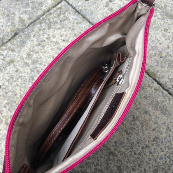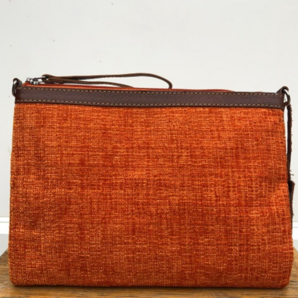 Exterior fabric is a beautiful tapestry fabric. Fully lined interior with phone pocket. Genuine leather trims with across body strap and wristlet.